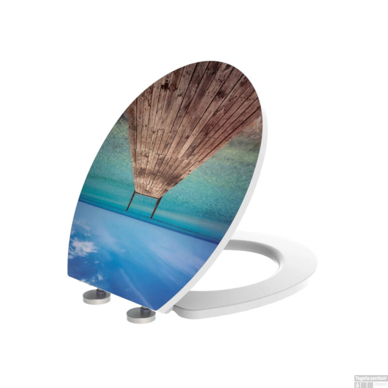 De Noumea is een toiletzitting van het bekende merk Allibert. De zitting heeft een vrolijke look. Omdat het een plaatje heeft wat je het gevoel van vakantie geeft met het fraaie blauwe water. De zitting heeft twee RVS scharnieren die gebruik maken van het soft close systeem. Soft close is dat de zitting rustig en zacht sluit. De zitting zelf is gemaakt van het materiaal duroplast. Het heeft een breedte van 38 cm, de lengte is 43,5 cm en de dikte is 6 cm.
