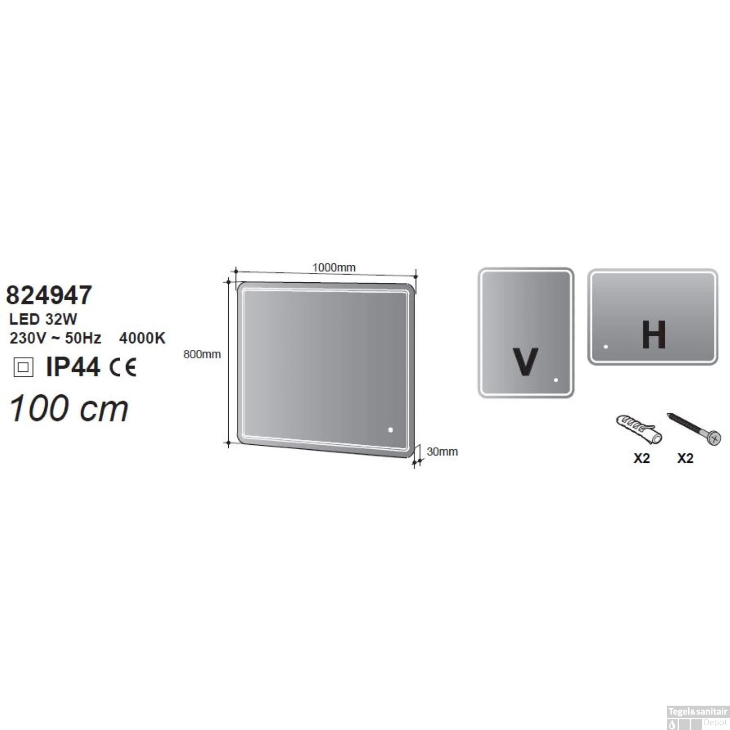 Specificaties Badkamerspiegel Allibert Kruz LED Verlichting 32 W Rechthoek 100x80x3 cm