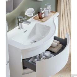 Het meubel is voorzien van 2 lades en 1 deur die allemaal het soft close systeem hebben, hiermee zullen de lades en de deur niet dicht klappen maar zachtjes dicht vallen. Bij deze set krijgt u een wastafel van Polybeton meegeleverd. De afmetingen van deze set zijn; 90 cm breed, 49,5 cm hoog en 44 cm diep.