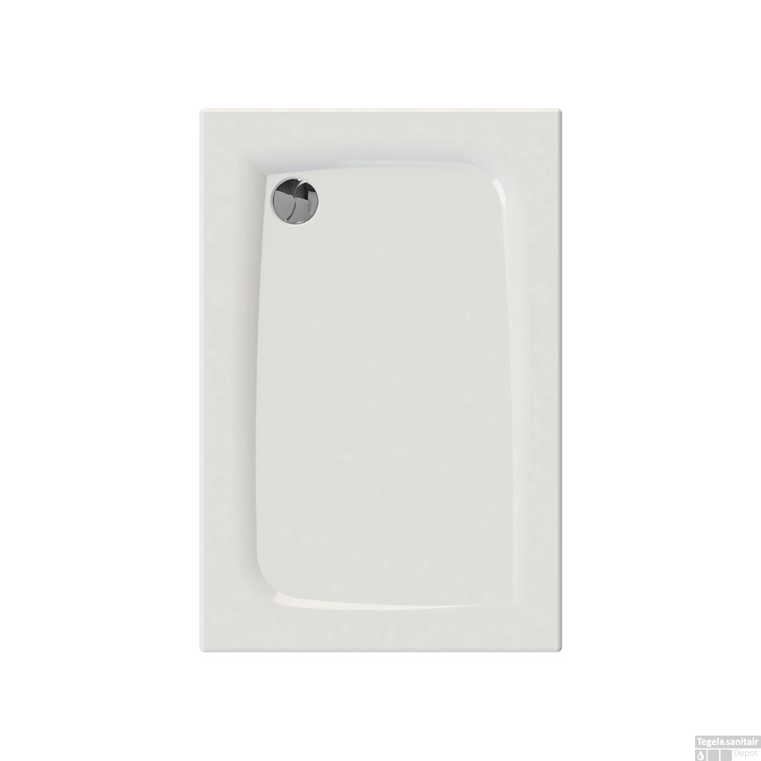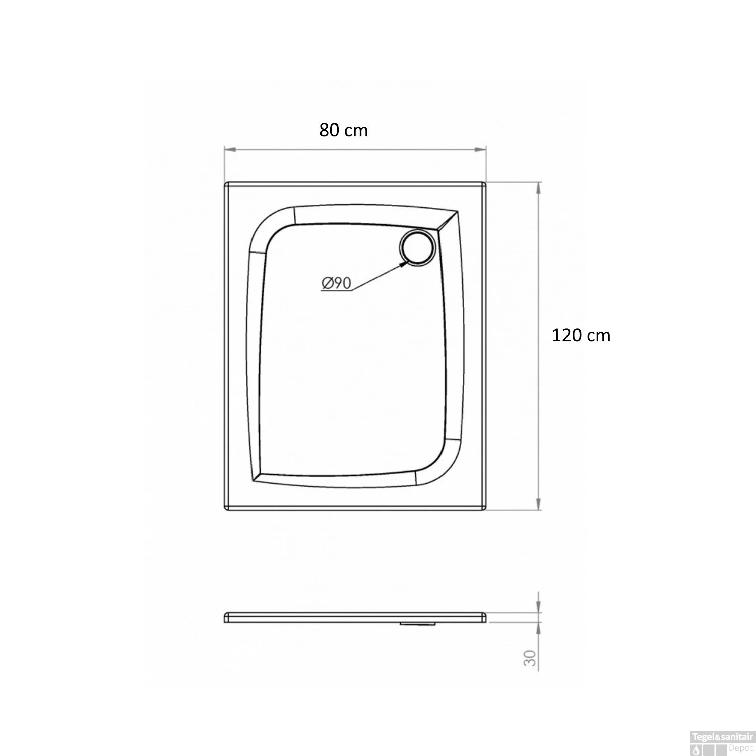 De rechthoekige douchebak heeft een breedte van 120 cm, een diepte van 80 cm en een hoogte van 3 cm. Onderaan de webpagina kunt u ervoor kiezen om een bijpassende douchebakafvoer van het merk Allibert aan de bestelling toe te voegen. Deze douchebakafvoeren zijn leverbaar in een chrome, witte en extra platte variant voor een meerprijs.