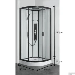 Op de wit gekleurde achterwanden bevindt zich een douchepaneel dat is uitgerust met een douchekop, een handdouche (met drie standen) een greep waarmee de mengkraan aan- en uitgezet wordt en doucheslang met een lengte van 150 cm. De vierkante douchekop zit in het plafond van de cabine geïntegreerd. De glaswanden steunen op een witte douchebak met een breedte en diepte van 90 cm, terwijl de hoogte 14 cm bedraagt. De wanden hebben een hoogte van 225 cm. Door middel van het ‘clipsysteem’ is deze cabine eenvoudig te monteren. Door de massagestralen die uit het zijpaneel komen kunt u optimaal genieten van uw douche.