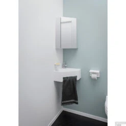 Deze hoek fontein komt uit de serie van Nexo. De strakke vormgeving en mat witte kleur maken dat dit een elegant stuk in uw toilet is. Doormiddel van een ruimte aan de voorkant heeft u uw handdoek direct bij de hand, ideaal voor in een kleine toilet ruimte. Het meubel wordt gemonteerd geleverd en dient opgehangen te worden.