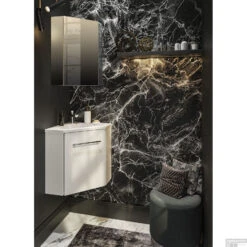 Dit fonteinmeubel uit de Corner-serie van Allibert is een fijne toevoeging aan uw badkamer. Het hoekmeubel is ruimtebesparend en daarmee ideaal voor de kleinere ruimtes. Bovendien hangt het meubel aan de wand, waardoor u ruimte op de vloer overhoudt! De set bestaat uit een porseleinen wasbak en het fonteinmeubel. Het meubel bevat 1 deur met een handvat die tevens als handdoekhouder dient. De deur is voorzien van softclose scharnieren voor een geruisloze sluiting.