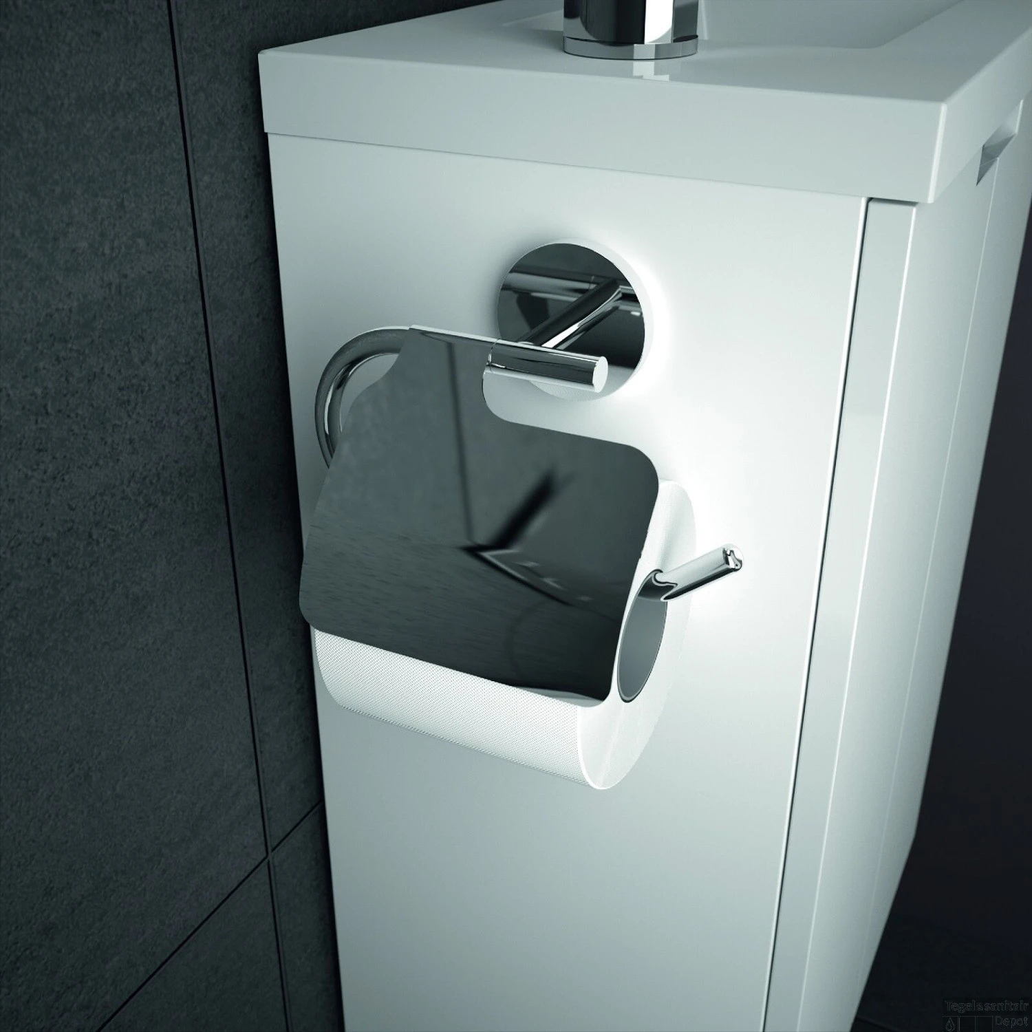 Bovenop de onderkast bevindt zich de wastafel die is gemaakt van polybeton. Aan de linkerzijde van de wastafel bevindt zich een kraangat. Wat de Closy Pack-set onderscheidt van andere fonteinsets is dat deze set ook geleverd wordt met een toiletrolhouder en een handdoekhouder: beide artikelen bevinden zich aan de zijkanten van de kast. Met de spiegel die u aan de muur bevestigt wordt de fonteinset compleet gemaakt.