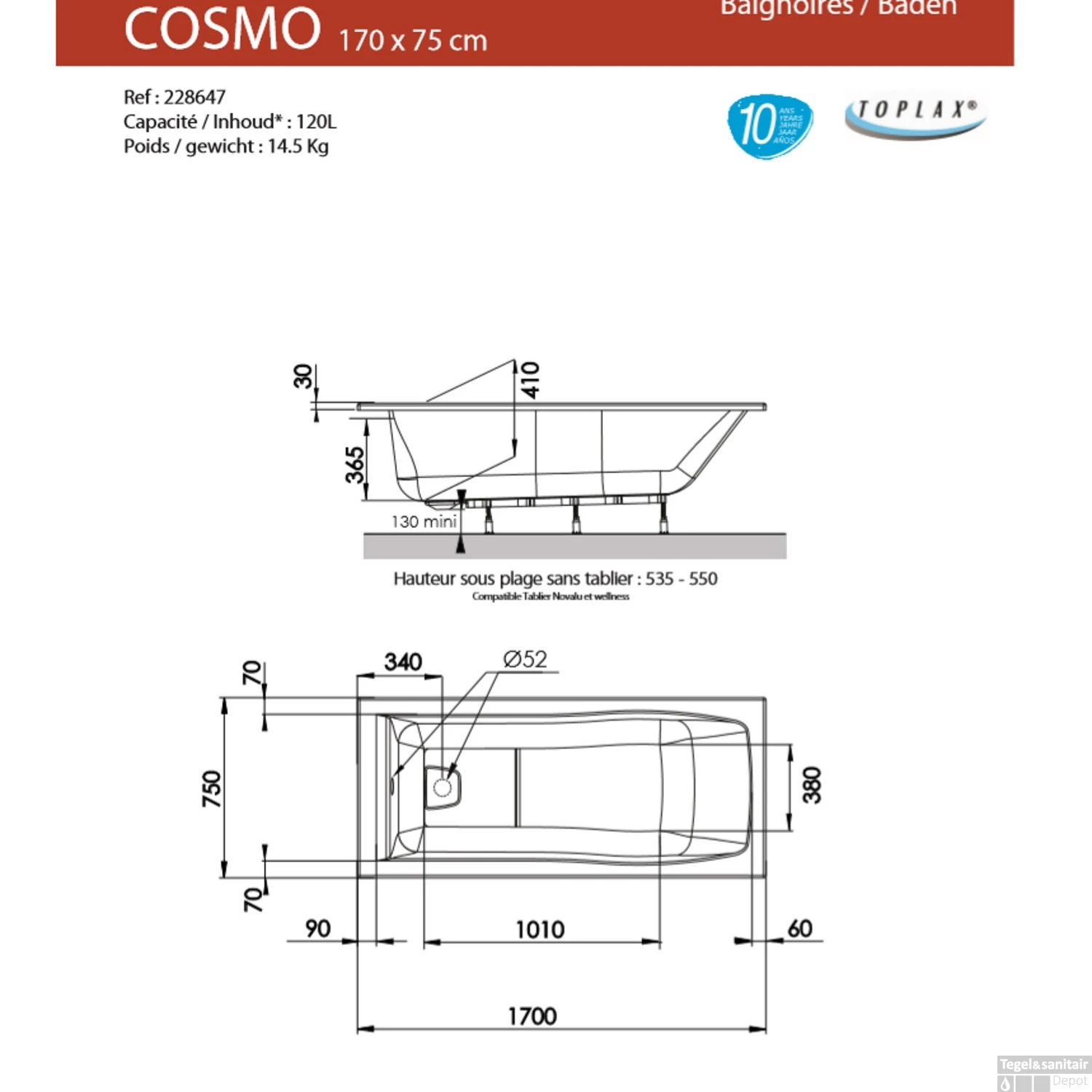 Allibert’s ligbad Cosmo is een schitterend bad die past bij een moderne badkamer. In dit bad kun je goed relaxen. Dit bad heeft twee opties je kunt er rustig in relaxen of je kan douchen aan de voorzijde bij de douchezone. De badrand heeft een breed oppervlak waar u uw spullen op kunt plaatsen. Het is een mogelijkheid om een kraan in de badrand te integreren. Het word inclusief poten geleverd. De afmeting van het bad is 170 cm lang, 75 cm breed en 55 cm hoog.