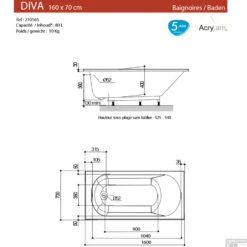 Het Ligbad Allibert Diva 160×70 cm geeft uw badkamer een stijlvolle look. De afmetingen van dit bad zijn Lengte: 160 cm de Breedte: 70 cm en de Diepte 40 cm. De volume is 80-150 liter. U kunt even helemaal tot rust komen in dit prachtige ligbad. De badpoten worden meegeleverd.