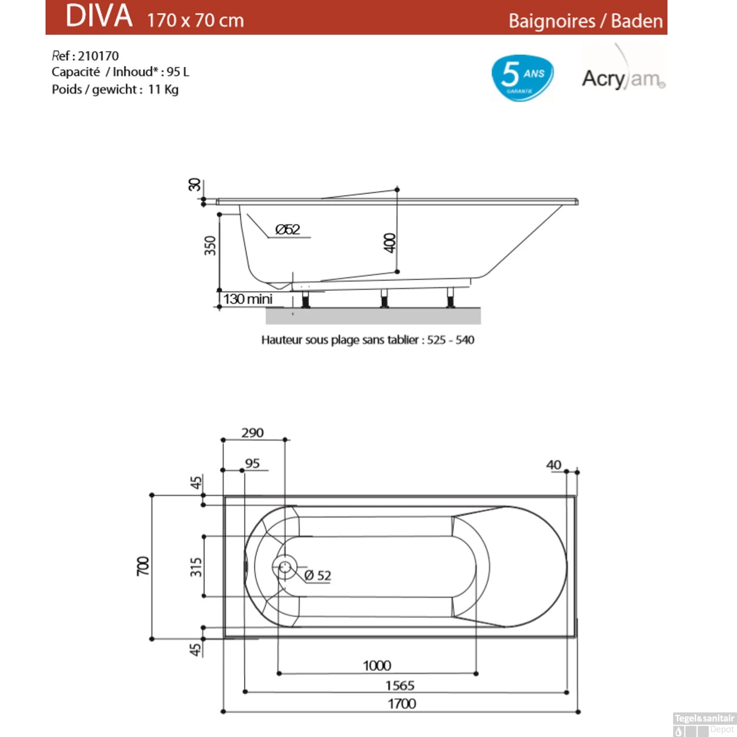 Het Ligbad van Allibert is een bad met strak uiterlijk. Het bad past echt bij elke badkamerruimte. De afvoer is gecentreerd in de lengte van het bad. Bij het bad zijn de poten inbegrepen. Het bad heeft een lengte van 170 cm, een breedte van 70 cm en een hoogte van 40 cm. Het materiaal wat gebruikt is voor het bad is acryl. Het materiaal acryl heeft het voordeel dat bacteriën en vuil zich nauwelijks hechten.