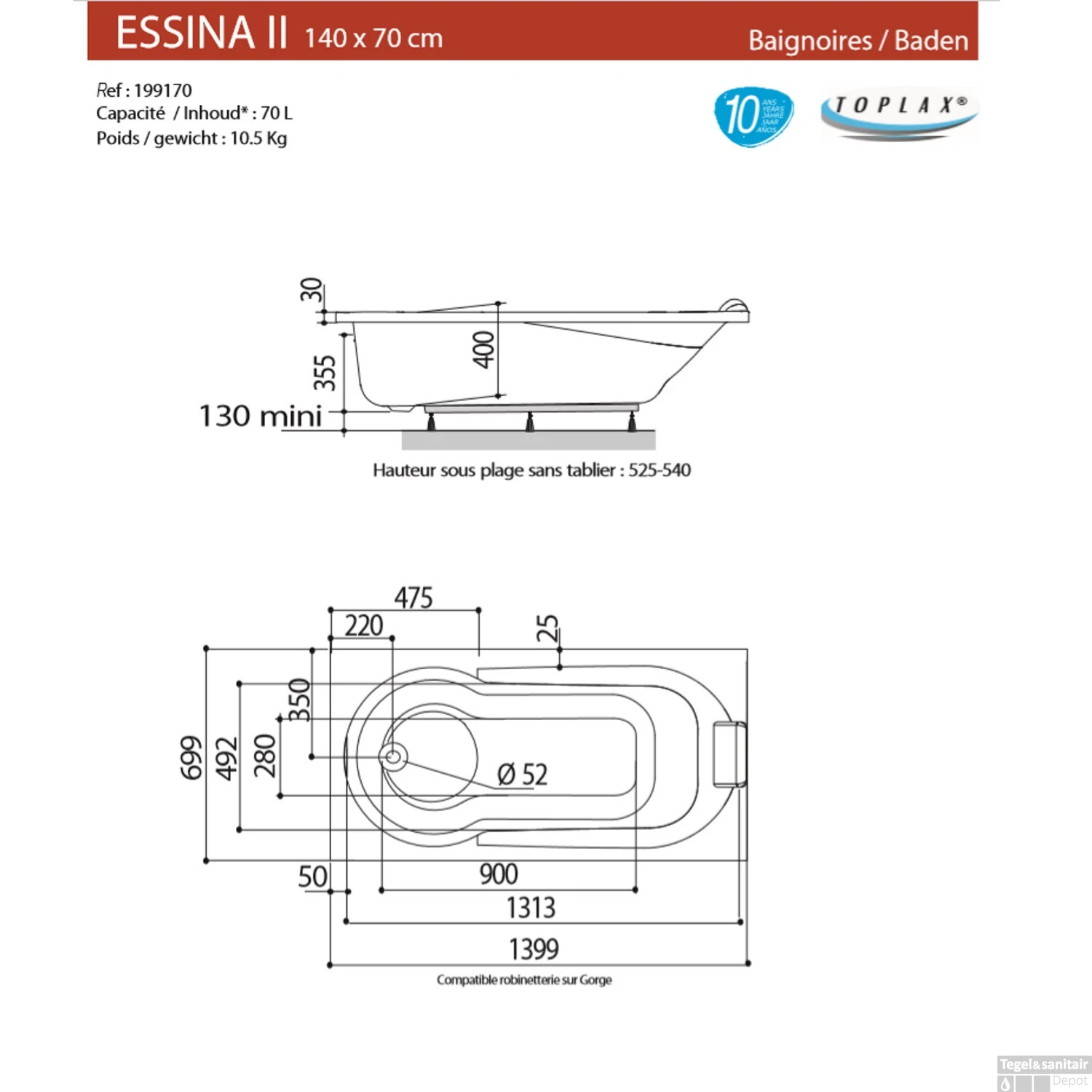 Bent u op zoek naar een Ligbad waar u goed kan relaxen? Dan is de Essina² de uitstekende keuze. Het figuur van het ligbad is perfect voor relaxen, omdat de hoofd- armsteunen comfortabel liggen. Wilt u douche dan kan dat ook want met deze badkuip kunt uw rustig in bad of u kunt gemakkelijk douchen. De lengte van het bad is 140 cm bij 70 cm breed en een hoogte van 53,5 cm.