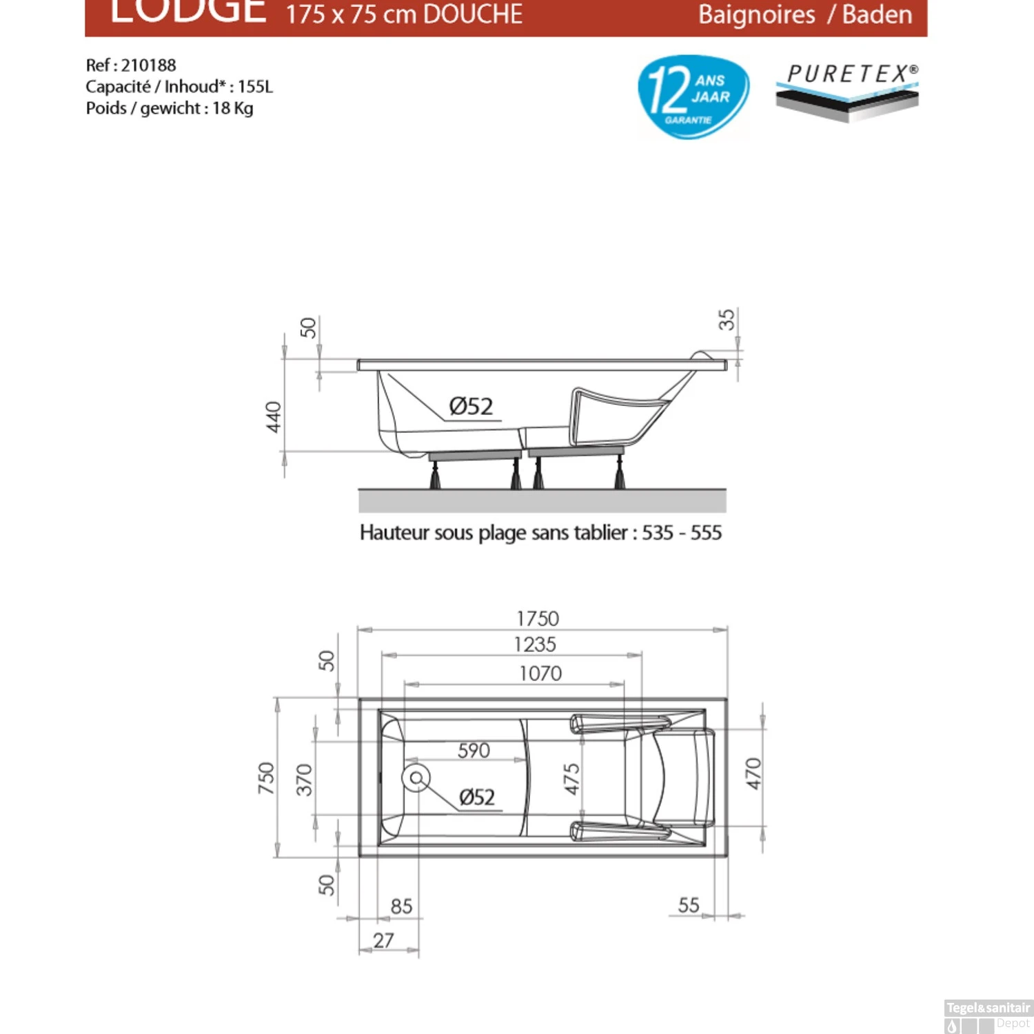 Met het Ligbad Allibert Lodge Douchezone 175×75 cm kunt u helemaal ontspannen. Met geïntergreerd hoofd- en armsteunen kan u helemaal ontspannen en met de douchezone kunt u ook lekker douchen in het bad. De afmetingen van het bad zijn Lengte 175 cm de Breedte 75 cm de Hoogte 53,5-55,5 cm en de Diepte 44 cm. Dit bad wordt standaard geleverd met pootjes.