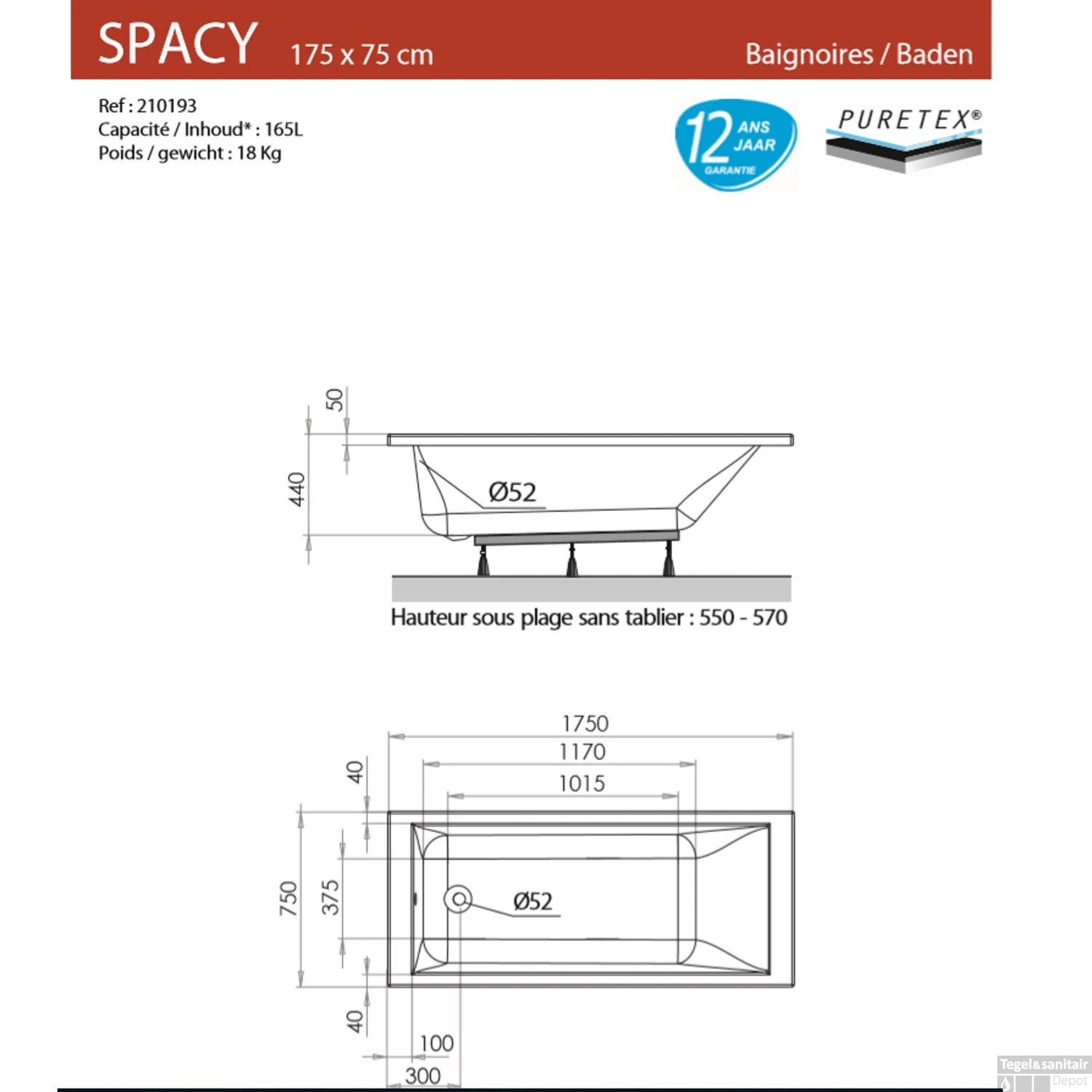 Het bad Spacy van Allibert is een bad met een moderne uitstraling. Het bad is perfect om in te relaxen na een drukke dag. Het bad heeft een rugleuning die comfortabel ligt. Het bad heeft een lengte van 175 cm, een breedte van 75 cm en een hoogte van 57 cm. De afvoer in in de lengte gecentreerd. Het bad word inclusief met poten geleverd.