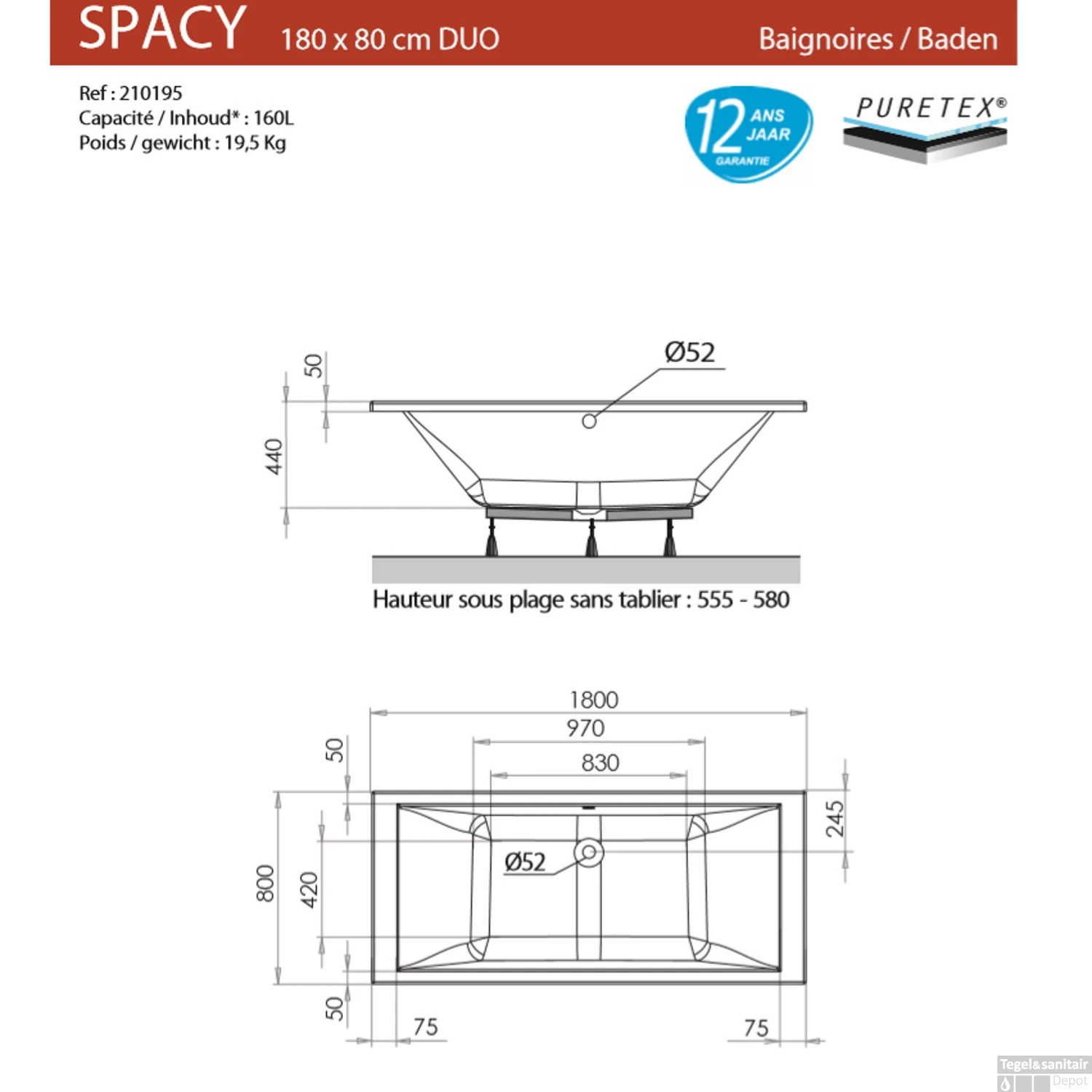 Met het Ligbad Allibert Spacy 180×80 cm geeft u uw badkamer een stijlvolle look. De afmetingen van dit bad zijn Lengte: 180 cm de Breedte: 80 cm de Hoogte: 58-60 cm en de Diepte: 44 cm. Met een dubbele rugsteun is dit bad ideaal voor z’n tweeën en verliest dit bad zijn comfort niet. Het bad is ABS-versterkt en wordt standaard geleverd met pootjes.