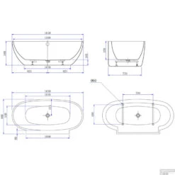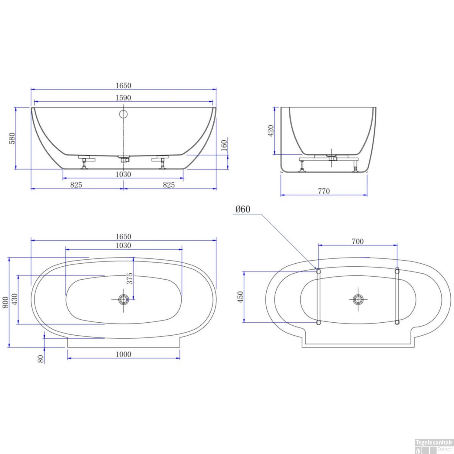 Het bad wordt standaard geleverd met pootjes en een afvoerplug click-clack. De afmetingen van het bad zijn Lengte: 165 de Breedte: 80 cm de Hoogte: 57 cm en de Diepte: 42 cm. Het volume van het bad is 140-210 Liter.