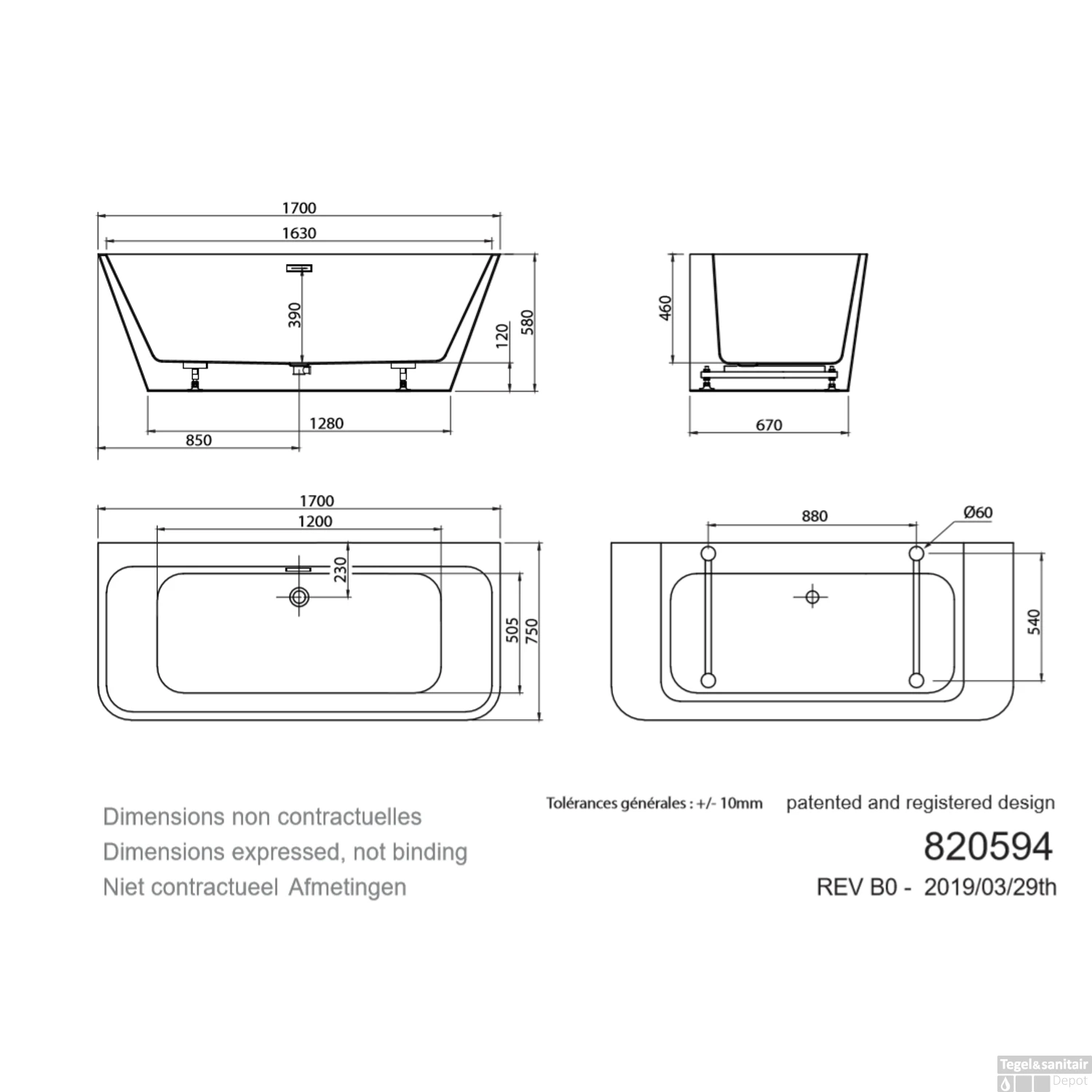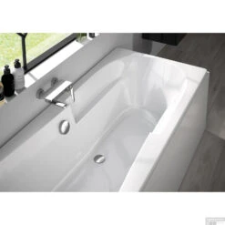 Er is een mogelijkheid om een kraanbatterij te plaatsen in de badrand. De afmetingen van het bad zijn de Lengte: 170 cm de Breedte: 75 cm de Hoogte: 58 cm en de Diepte: 46 cm