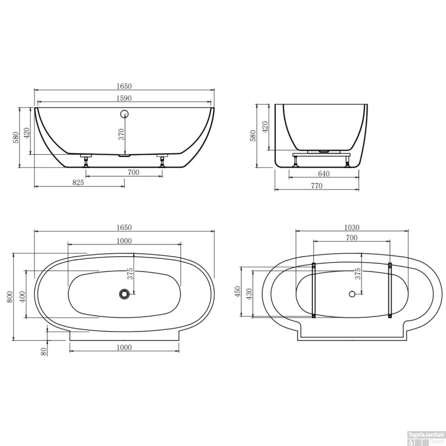 De lengte van dit bad is 165cm, de breedte is 80 cm en de hoogte is 42 cm. Als het bad op de poten staat dan is deze 58 cm hoog. Het bad heeft een inhoud van 140 tot 210 Liter water, en leeg weegt dit bad 33,5 kg.