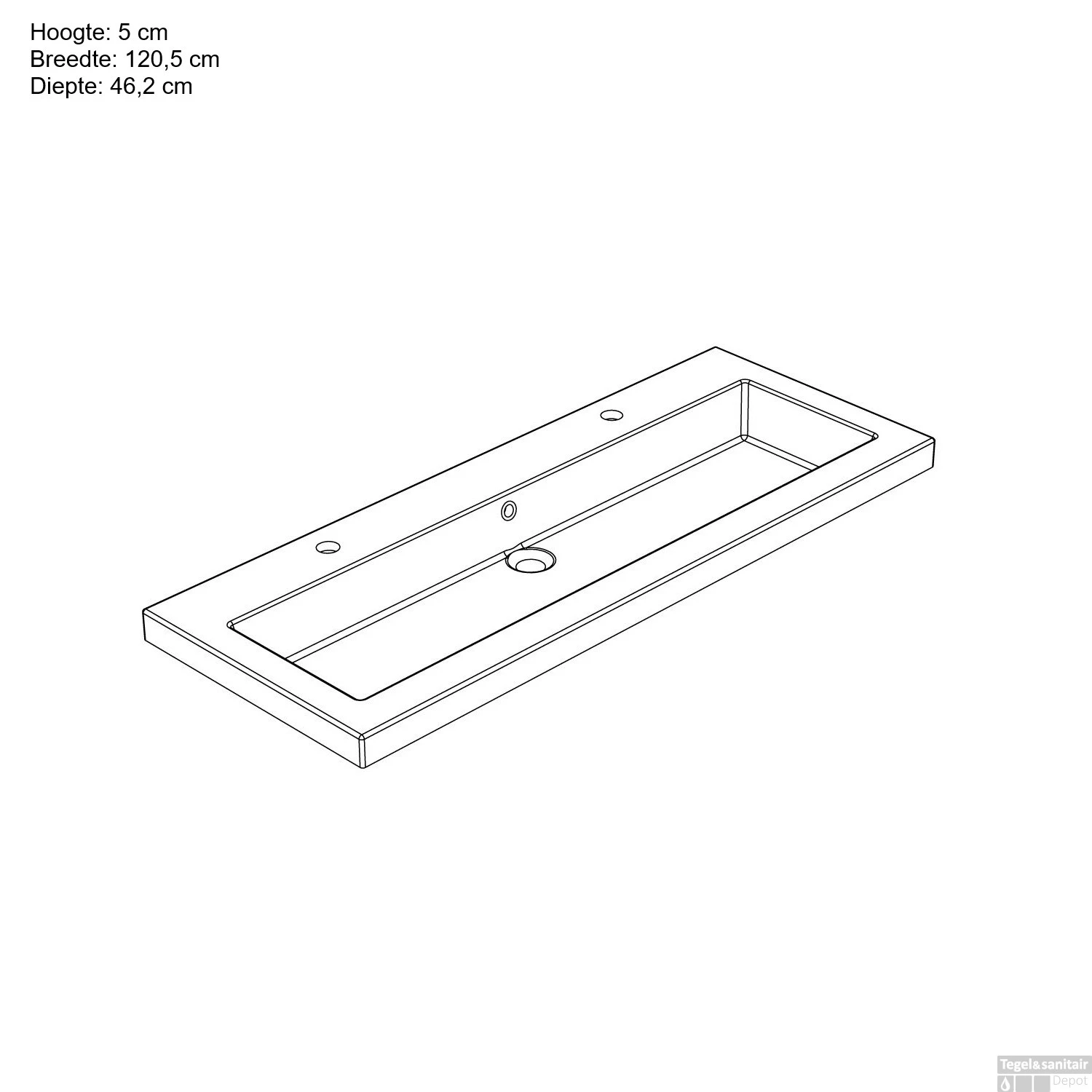 Deze wastafel heeft de afmetingen; 120,5 cm breed, 46,2 cm diep en 5 cm hoog. Hij is makkelijk schoon te maken door het materiaal waarvan hij gemaakt is. Het enige wat u hoeft te doen is met een vochtige doek er overheen te vegen om deze wastafel te reinigen.