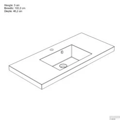 Deze wastafel is een enkele wasbak met de afmetingen 100,2 cm lang, 46,2 cm breed en 5 cm hoog. Het is een inbouw wastafel voor bovenop een onderkast.