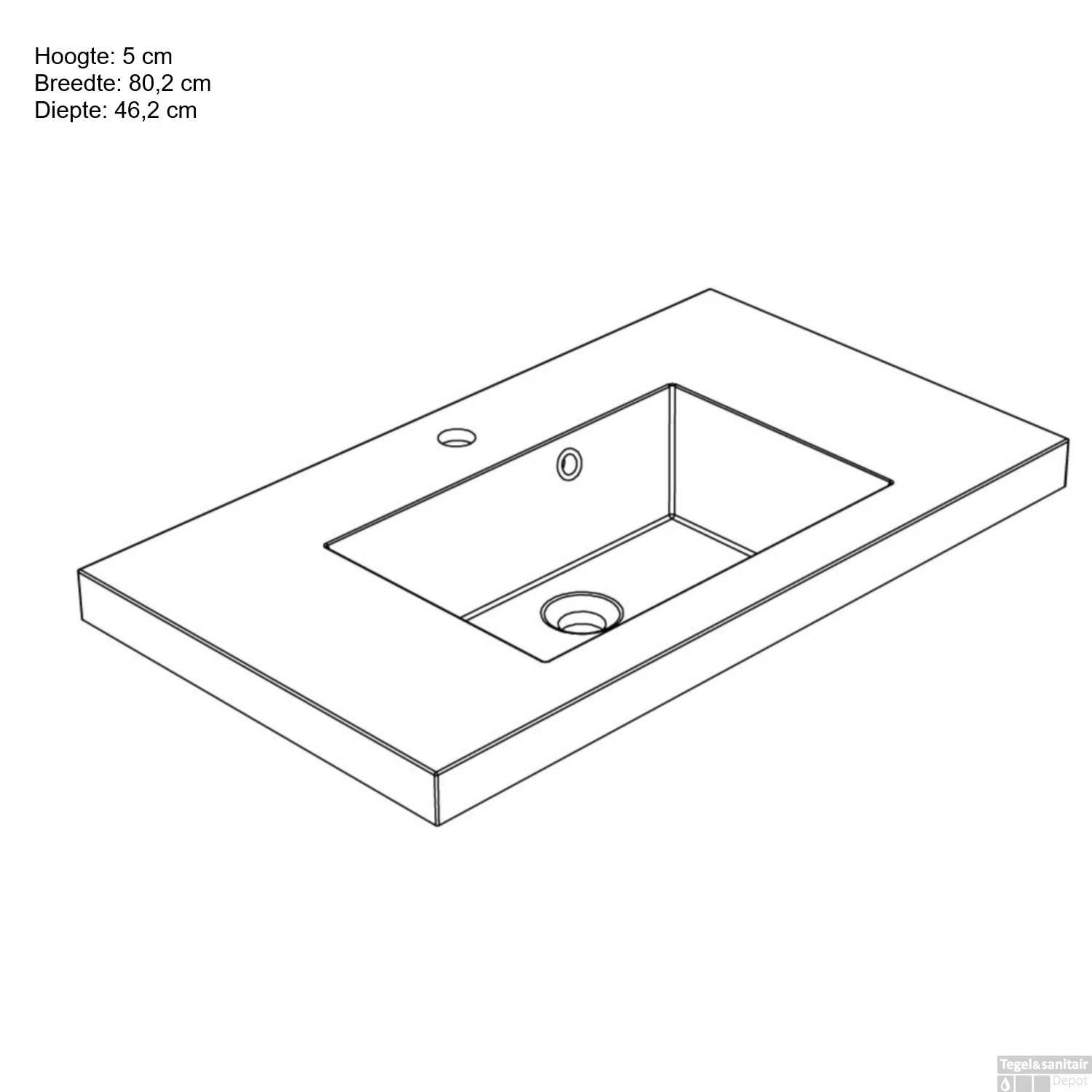 Deze wastafel is een enkele wasbak met de afmetingen 80,2 cm lang, 46,2 cm breed en 5 cm hoog. Het is een inbouw wastafel voor bovenop een onderkast.