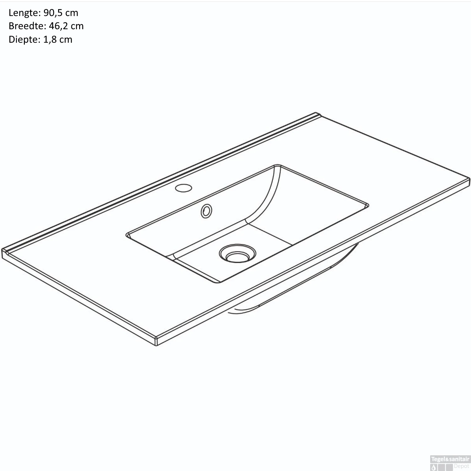 Deze wastafel heeft de afmetingen; 90,5 cm breed, 46,2 cm diep en 1,8 cm hoog. Hij is makkelijk schoon te maken door het materiaal waarvan hij gemaakt is. Het enige wat u hoeft te doen is met een vochtige doek er overheen te vegen om deze wastafel te reinigen.
