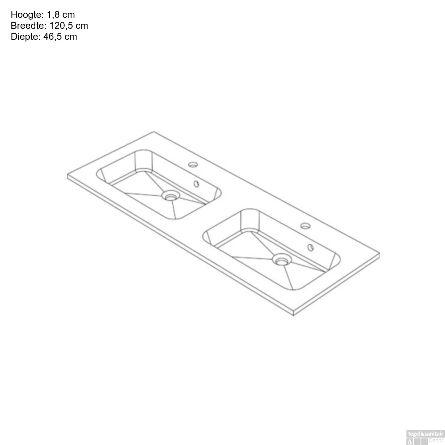 Deze wastafel heeft de afmetingen; 120,5 cm breed, 46,5 cm diep en 1,8 cm hoog. Het gewicht van deze wastafel is 8,5 KG.