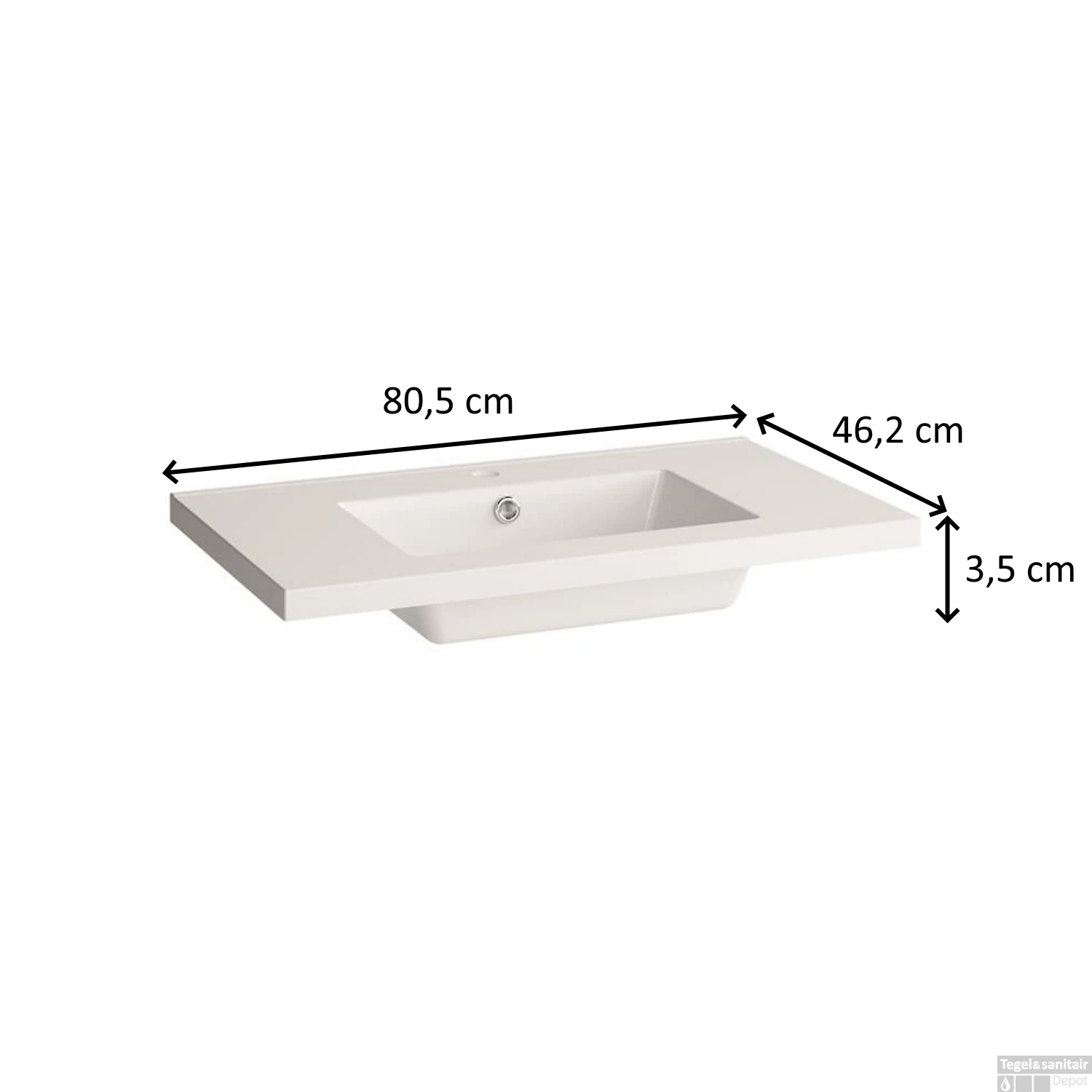 De Tobi inbouw wastafel is van het merk Allibert. De wastafel is gemaakt van porselein en afgewerkt in een hoogglans witte kleur. Tevens is deze wastafel voorzien van een kraangat in het midden en een overloop. De overloop zorgt ervoor dat de wasbak niet overstroomt wanneer de kraan te lang aan staat bij gebruik. De Tobi wastafel heeft een breedte van 80,5 cm, een diepte van 46,2 cm en een hoogte van 3,5 cm.