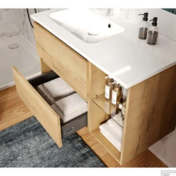 Deze mooie wastafelonderbouw van Allibert komt uit de serie Lunik. Hij is voorzien van 2 lades die weer voorzien zijn van een soft close systeem en 1 nis. Er zit een enkele sifonuitsparing aan de linkerkant in deze wastafelonderbouw. Het meubel is gemaakt in de kleur eik halifax. De afmetingen van deze onderbouw zijn 90 cm breed, 55 cm hoog en 46 cm diep. De nis heeft een breedte van 30 cm.