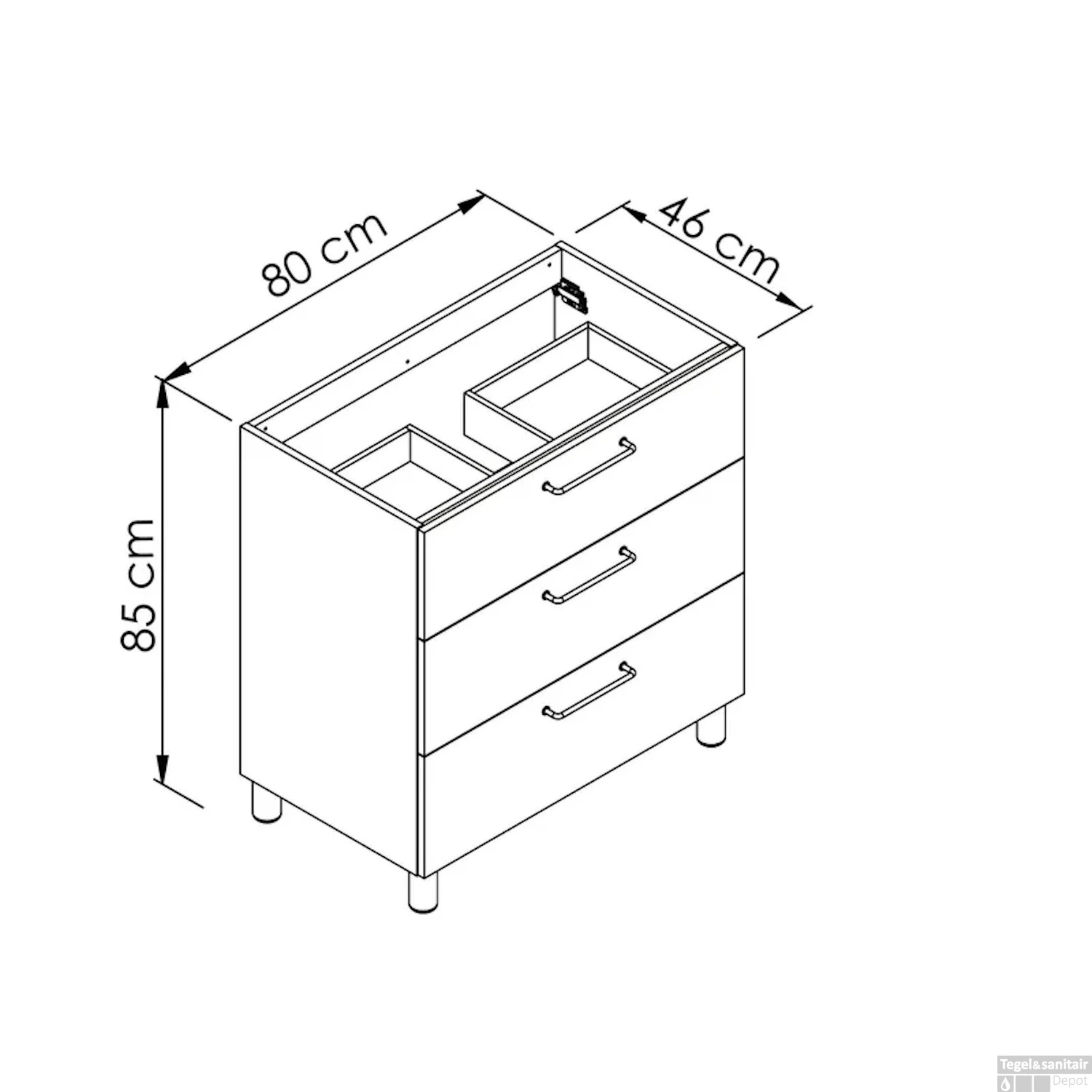 De poten zijn goudkleurig en de lades zij voorzien van soft close. Dit houdt in dat zodra de lades sluiten, ze niet dichtklappen, maar vanzelf rustig sluiten. De afmetingen van deze kast zijn: 85 cm hoog, 80 cm breed en 46 cm diep.