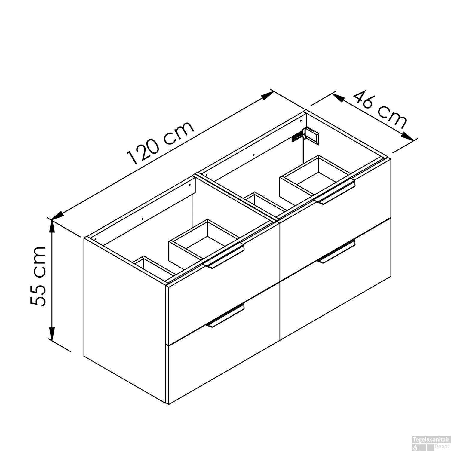 De lades bevatten soft close dit houdt in dat de deuren zodra ze sluiten, niet dichtklappen, maar vanzelf rustig sluiten. De afmetingen van deze wastafelonderkast zijn: 55 cm hoog, 46 cm diep en 120 cm breed.