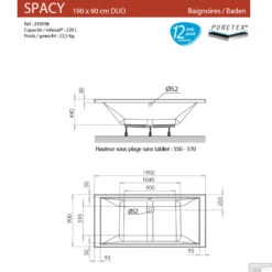 De afvoer van dit bad zit in het midden van de bodem, en wordt zonder afvoergarnituur geleverd. Wel worden er poten mee geleverd voor onder het bad, deze zijn ook nog eens verstelbaar van 52 cm tot 53 cm. De inhoud van dit bad is 100 tot 170 Liter water.