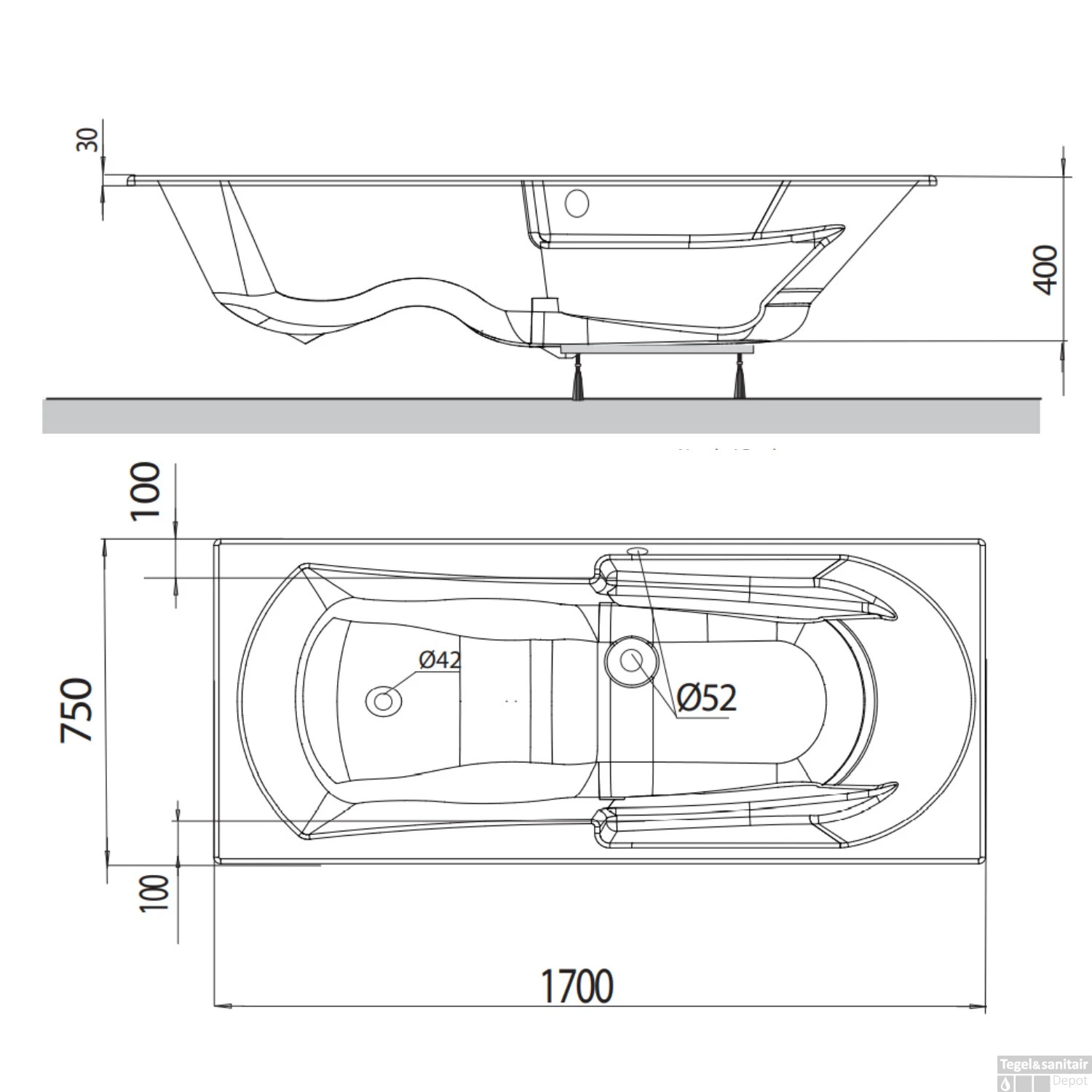 Het bad heeft een zitdiepte van 40 cm, een lengte van 170 cm, een breedte van 75 cm en een hoogte van standaard 45 cm wat verhoogd kan worden door de verstelbare badpoten.